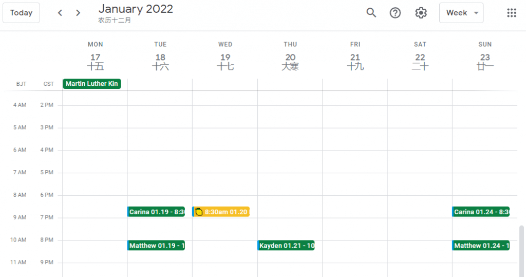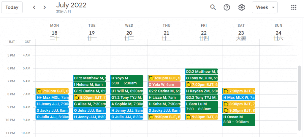 There are a lot of ways to customize a free Google Calendar to manage scheduling online classes for students in a different time zone from your own – even in China. It’s also possible to fit a lot of information into the event title so that you can see it all at a glance without clicking through each appointment. Being able to quickly see 2 timezones simultaneously is especially useful when a parent wants to reschedule the class they have booked since they will refer to their classes in their own date/time.