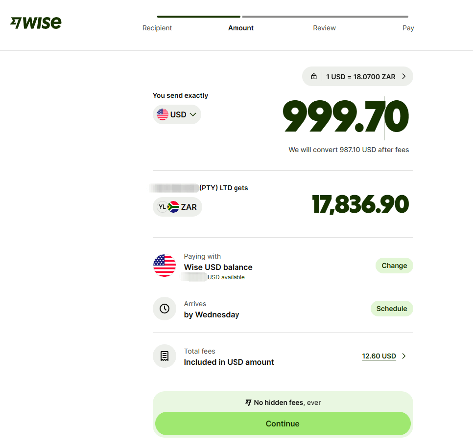 | Conversion (rate and fee) from USD to preferred currency | See above screenshot from Wise | R17,623.52 (Google estimate) | R17,623.52 (Google estimate) |