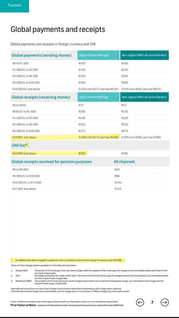 First National Bank doesn’t have a flat rate fee for accepting foreign currency. Instead they adjust their fees based on the amount being received. They also add on an additional fee for large transfers, as you can see in the highlighted areas on the screenshot below.